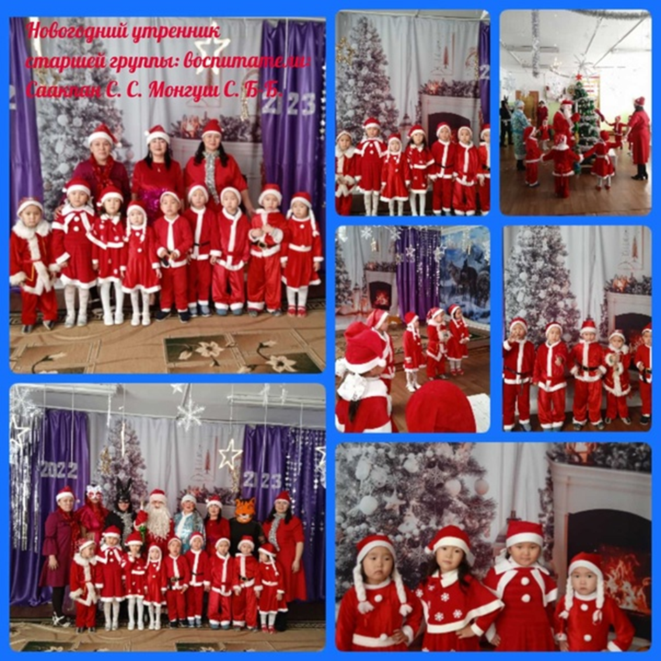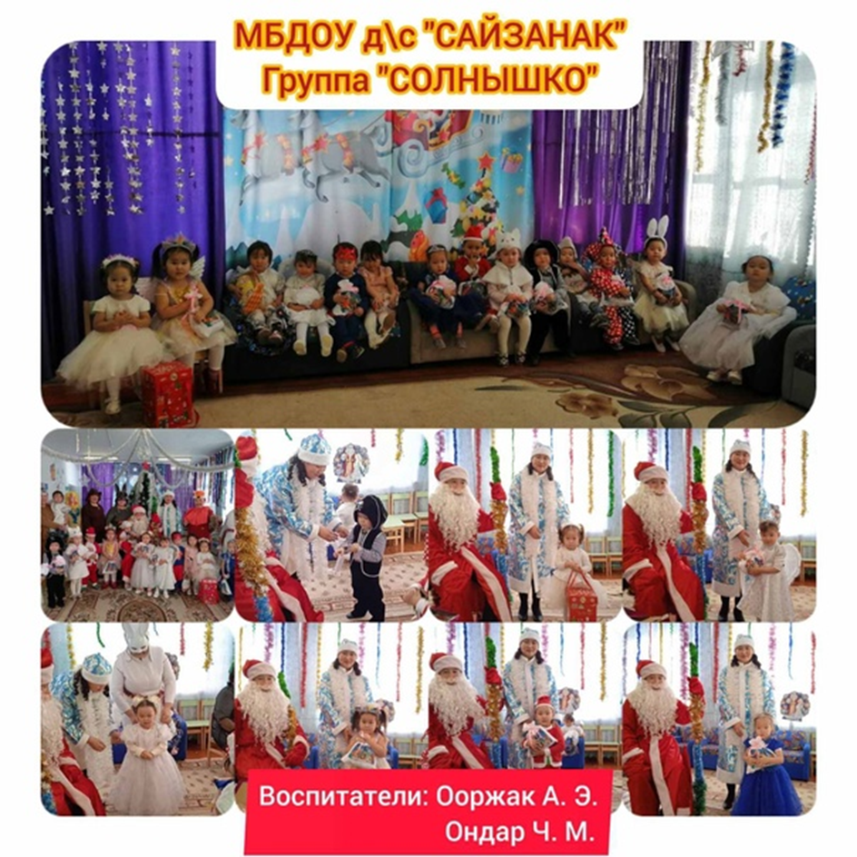 Согласно Годовому плану в МБДОУ д/с «Сайзанак» с. Шекпээр были проведены новогодние утренники с 26.12. по 28. 12.2022 г. с целью создания у детей праздничное новогоднее, сказочное настроение. Доставить детям радость от встречи с Дедом Морозом, Снегурочкой и другими сказочными персонажами. Задачи: 1. Познакомить детей с персонажами различных сказок. 2. Воспитывать чувство коллективизма. 3.Получить удовольствие от общения в процессе праздника со сверстниками, от совместных музыкальных номеров и коллективных игр. Обхват детей: 70